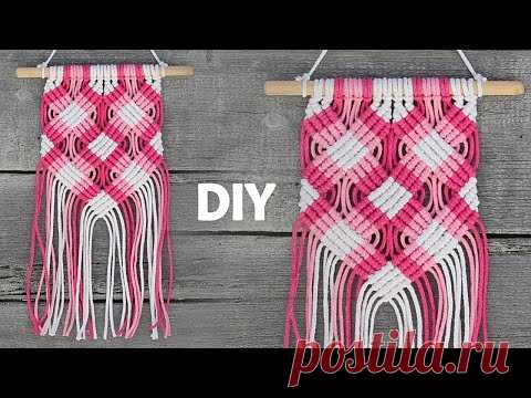 На изображении представлены два макраме-панно, выполненные в розово-белых тонах и висящие на деревянной палке. Каждое панно состоит из сложных узоров, где розовые и белые нити переплетены в геометрические фигуры. Панно подвешены с помощью белых веревок. Каркас выполнен из светлого дерева, что хорошо сочетается с общим цветовым решением. Фон изображения представляет собой поверхность из серого дерева, создавая контраст и подчеркивая яркость макраме. Мягкое освещение создаёт теплую атмосферу, придавая предметам немного объема и выделяя текстуру нитей. Между двумя панно размещена надпись "DIY", что подчеркивает тематику ручной работы. Это может быть образовательный контент, связанный с искусством макраме, возможно связанный с источником, таким как видео от Olga Vas Macrame.