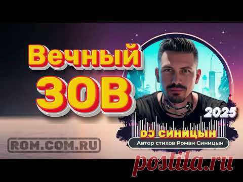 Изображение представляет собой яркую музыкальную афишу, на которой изображен мужчина с короткими тёмными волосами и небольшой бородой. Его уверенный взгляд подчёркнут ярким светом, падающим на лицо, создавая современную и энергичную атмосферу. На фоне – абстрактный городской пейзаж с неоновыми оттенками голубого и фиолетового цветов. В центре афиши крупный текст: "Вечный зов" в жёлтых и красных тонах, создающий сильный контраст с тёмным фоном. Под изображением находится текст "DJ Синицын" и "Автор стихов Роман Синицын", что указывает на авторство и специфичность музыкального произведения. Графические элементы, такие как звуковая волна и значок 2025, дополняют высокотехнологичное впечатление. Композиция сбалансирована, изображение имеет глубокую перспективу и динамичное расположение элементов, что привлекает внимание к ключевым визуальным элементам и создает чувство современности и новаторства. Лёгкая неоновая подсветка добавляет образу живость и энергетику, которая естественно перекликается с клубной культурой и электроникой.