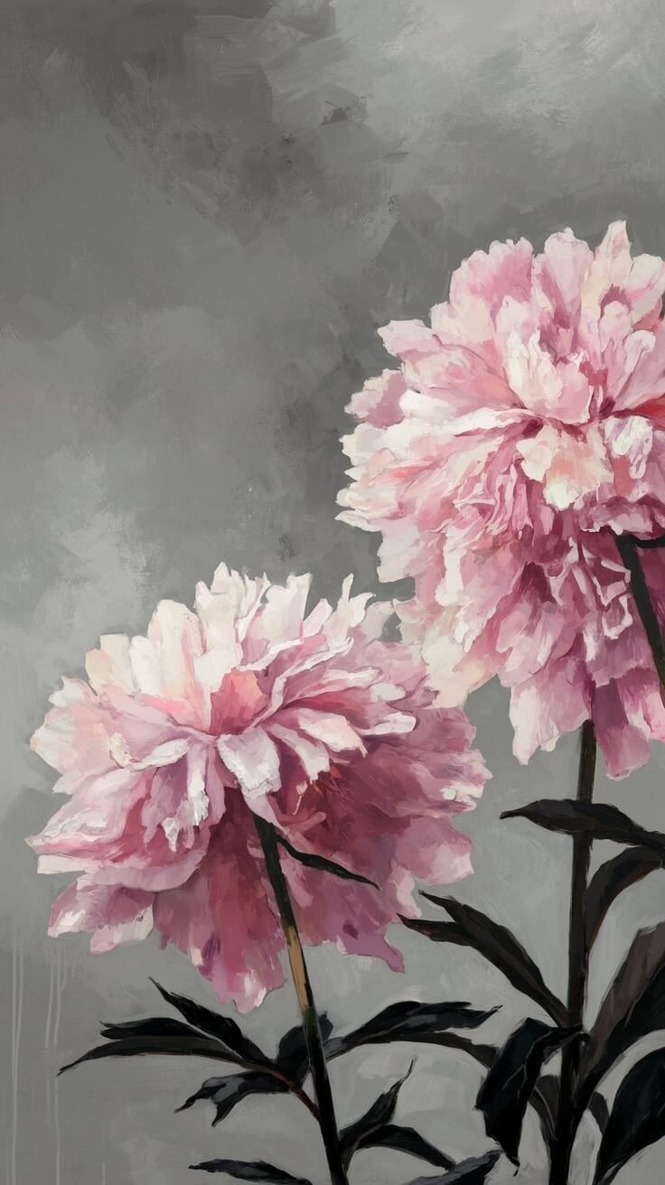 На изображении представлены два пышных цветка пиона нежно-розового цвета, выполненные в стиле живописи. Цветы расположены на фоне серого градиента, который создает мягкий уютный контраст с их яркими лепестками. Лепестки цветов кажутся воздушными и легкими, выполненные с акцентом на светотени, создающие эффект объемности. Цветы изображены на длинных тонких стеблях с темно-зелеными листьями. В картине передан эффект светотени, который подчеркивает текстуру и материал лепестков, делая их реалистичными. Общая композиция создает впечатление спокойствия и гармонии, пробуждая ощущение прикосновения к природе. Необычное сочетание цветов и техник делает изображение живописным и привлекательным, а текст "Типы и виды цветочного оформления ландшафта" придаёт академический контекст, отсылая к искусству создания ландшафтов. Общая световая тональность картины мягкая, рассеянная, как будто освещенная предвечерним солнцем.