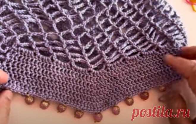 На изображении представлено вязаное изделие, выполненное крючком, предположительно головной убор. Оно имеет сложную фактуру с чередующимися плотными и ажурными рядами, создающими интересный визуальный эффект. Цвет изделия — нежно-фиолетовый, приближенный к лавандовому, что придаёт ему изысканность и воздушность. По нижнему краю изделия выделяется ряд прикрепленных декоративных элементов в виде бусин, которые дополнительно украшают аксессуар и добавляют ему шарма. Изделие удерживается руками, видны пальцы, аккуратно демонстрирующие структуру вязания. Освещение мягкое, рассеянное, подчёркивающее текстуру и узор вязки. Весьма детализированная работа отражает высокое мастерство создателя. Окружающий фон нейтрален, что акцентирует внимание только на данном аксессуаре.