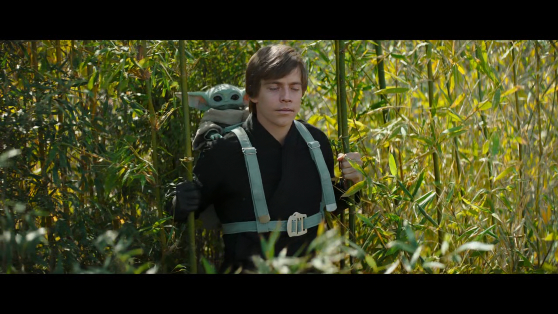 На изображении представлена сцена с персонажем, одетым в черную одежду, которая напоминает стилистику костюмов джедаев из вселенной "Звездных войн". На его лице спокойное выражение, глаза закрыты, что может указывать на медитативное состояние или использование силы. Позади него в рюкзаке сидит маленькое существо с большими ушами и выразительными глазами, известное как Грогу или "Малыш Йода". Оба персонажа находятся среди высоких зеленых стеблей, возможно, бамбука. Это создает атмосферу уединенности и спокойствия. Светлый источник исходит сверху, освещая лица и часть листвы, создавая контраст с тенями. Композиция в центре кадра сосредоточена на персонажах, окруженных богатой растительностью. Добавление надписи "Книга Бобы Фетта - Chapter 6: From the Desert Comes a Stranger (2022)" усиливает контекстualную связь с популярным сериалом, и предполагает, что изображение непосредственно связано с этой частью вселенной "Звездных войн", добавляя к изображению нотку приключенческого духа и загадки.
