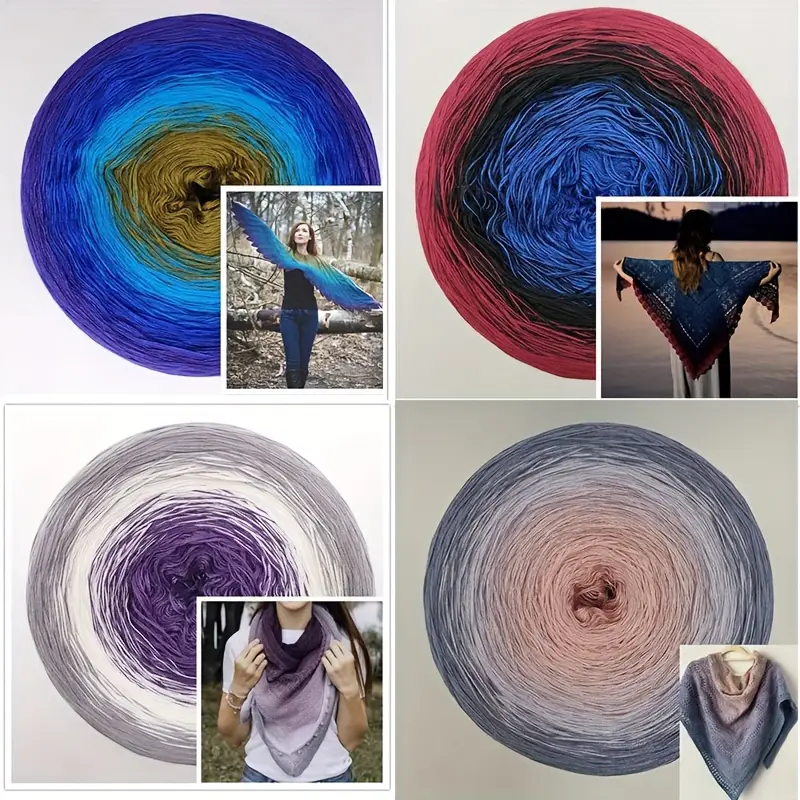 Изображение представляет собой четырёхсекционную композицию, в которой центральное место занимают мотки пряжи разных цветов. Верхний левый угол украшен пряжей с оттенками от тёмно-синего к жёлтому и изображением женщины, держащей в руках вязаный платок синевато-жёлтой расцветки. Верхний правый угол содержит моток пряжи, переходящей от красного к синему, и фотографию человека с разноцветным платком на фоне заката. Нижний левый моток выполнен в фиолетово-серых тонах; рядом представлена женщина с платком в руках. В нижнем правом углу располагается пастельный моток с розовыми и серыми оттенками, к которому прилагается изображение изделия мягкой цветовой гаммы. Вся композиция привлекает внимание играми цвета и текстур, эмоциональным фоном изображений с платками и спокойной атмосферой. Надпись на изображении говорит о предложении, действующем ограниченное время.