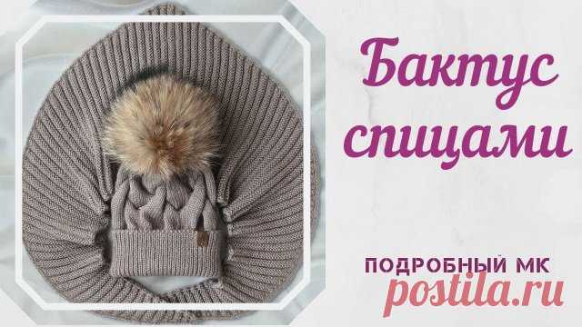 На изображении представлен бактус и шапка, изготовленные из пряжи нейтрального бежевого цвета. Текстиль имеет ребристую текстуру, что добавляет изделию объем и уют. Шапка украшена пушистым помпоном из меха, который придаёт аксессуару модный и стильный вид. Бактус имеет треугольную форму и выполнен в технике вязания спицами с чёткими линиями и изящной отделкой. На правой стороне изображения расположена надпись «Бактус спицами», выполненная фиолетовым шрифтом, а ниже справа текст «Подробный МК.» Характеристики вязки и дизайн аксессуаров создают впечатление ручной работы высокого уровня мастерства. Фон изображения нейтральный, что подчёркивает мягкость и утончённость предметов на переднем плане. Освещение мягкое, акцентирует внимание на деталях вязки и текстуре.