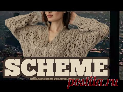 На изображении молодая женщина, одетая в модную вязаную куртку кремового цвета с ажурным узором. Куртка выполнена из натуральной шерсти, что подчеркивает её текстуру и придает изделию уютный и стильный вид. Женщина стоит в пол-оборота, что позволяет рассмотреть детали вязки и конструкцию куртки. Её поза расслабленная, она держит руки за головой, демонстрируя расширенные рукава и эластичный материал. Светлая куртка контрастирует с темным фоном, создавая ощущение глубины и акцента на одежде. Лицо женщины не полностью видно, что добавляет элемент загадочности и фокуса на самой одежде. Освещение мягкое, подчеркивающее текстурные особенности вязания. Верхняя часть изображения частично закрыта крупным текстом "SCHEME". На заднем плане — городская панорама, создающая ассоциацию с современным урбанистическим стилем. Этот образ можно ассоциировать с богемным шиком и современными тенденциями в вязании, демонстрирующими мастерство и внимание к деталям.
