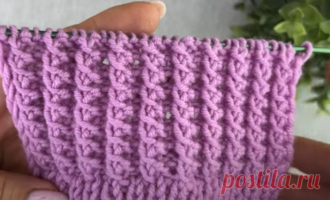 Изображение демонстрирует фрагмент вязаного узора, выполненного из пряжи светло-фиолетового цвета. Материал имеет мягкую и объемную текстуру, что свидетельствует о его вероятной износостойкости и комфорте при носке. Узоры, образующие ряды вертикальных полос, придают вязанию эстетически приятный и декоративный вид. На переднем плане руки, ухоженные и с нейтральным маникюром, держат образец за концы. Освещение мягкое, дневное, что позволяет рассмотреть каждую петлю и текстуру изделия. На заднем плане заметен размытый зеленый элемент, предположительно, растение, что добавляет композиции естественности и свежести. Присутствует текст "postila.ru" в красном цвете, который встроен в изображение и подчеркивает его визуальный стиль. Эмоциональная атмосфера изображения нейтральная, возможно, нацеленная на презентацию мастерства в вязании.