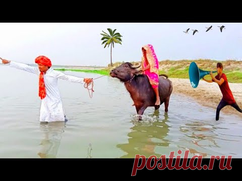 На изображении представлен необычный сельский пейзаж с тремя людьми, буйволом и яркими элементами традиционной индийской культуры. Центральное место занимают бурые буйволы, которых ведёт мужчина в белом одеянии и красной чалме. Он стоит по колено в воде и вытянул руку, словно указывая путь. Сзади на буйволе сидит женщина в ярко-розовом и оранжевом сари, головной убор закрывает часть её лица. Рядом ещё один мужчина использует синюю рупор, создавая сцену, полную юмора. На заднем плане виден пальма и стая птиц в небе, что придаёт обстановке тропический оттенок. Яркий солнечный свет создаёт жизнерадостную атмосферу, отображая сельскую жизнь в её беззаботности и веселии.