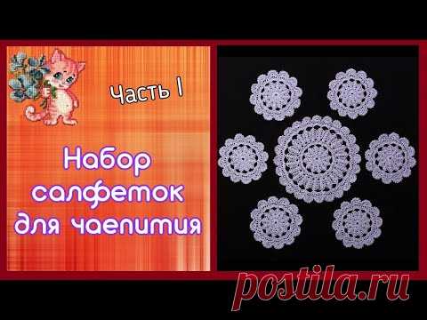 Изображение на левой стороне содержит текст "Часть 1. Набор салфеток для чаепития", написанный белыми и фиолетовыми буквами на оранжевом фоне с текстурой ткани. Справа изображены кружевные салфетки белого цвета на черном фоне, аккуратно расположенные в узор. Салфетки имеют круглую форму и отличаются сложностью узора, создавая элегантный и утонченный вид. В верхнем углу присутствует изображение милого котенка, держащего букет цветов, что добавляет изображению лёгкий и игривый оттенок. Композиция сбалансирована, акцентируется на красоте ручной работы и уютной атмосферой чаепития, внося элемент традиции и комфорта. Это создает знакомый и душевный визуальный эффект, который может быть связан с домашним уютом и семейными традициями. Освещение явно приглушенное, что делает акцент на текстуры и узоры, предоставляя глубокий визуальный интерес и создавая теплую ностальгическую атмосферу.