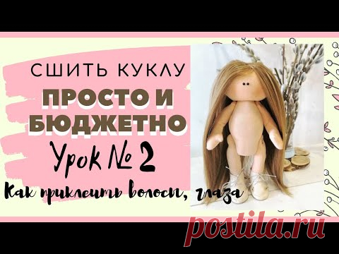 На изображении представлен заголовок с инструкциями по созданию куклы, который занимает левую часть композиции. Текст ярко выделяется на пастельных розовых и бежевых тонах, подчеркивая аккуратный крафтовый стиль. Надписи содержат информацию о том, как прикрепить волосы и глаза кукле, указывая на второй урок из серии. Справа расположена фотография куклы, выполненной в нейтральных мягких оттенках. Кукла имеет длинные светло-коричневые волосы, натуралистично уложенные, что привлекает внимание своей простотой и элегантностью. Кукла одета в минималистичную одежду и изображает милое выражение лица без прорисованных деталей, что придаёт ей универсальный вид. Фоном служат едва заметные декоративные элементы, создавая впечатление легкости и недосказанности. Определенные элементы в кадре напоминают о хэндмейд традициях, соответствующих современным тенденциям DIY культуры. Композиция и световое оформление тщательно продуманы, создавая теплую и уютную атмосферу, которая располагает к творчеству и экспериментам с созданием авторских кукол.