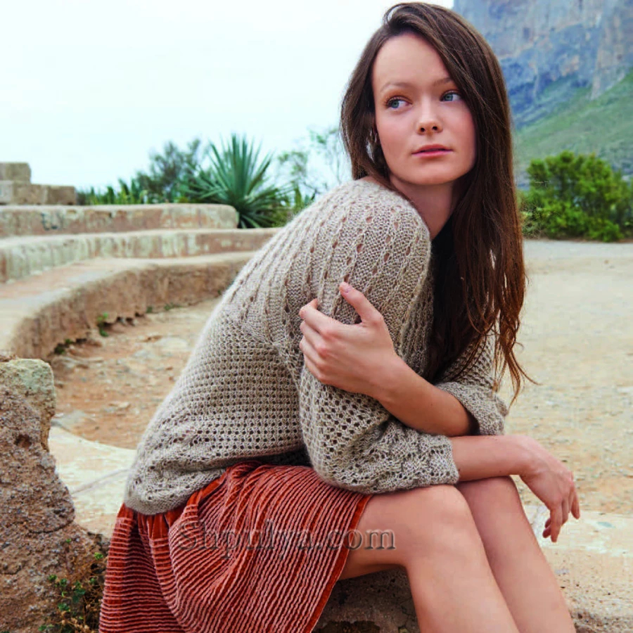 Если вы хотите сочетать замысловатые узоры с изысканной формой изделия, наш пуловер–именно то что нужно. Поскольку он вяжется единым полотном по кругу, швы здесь не предусмотрены. Еще один плюс: комбинация двух видов пряжи–пушистого мохера и гладкой нити из шерсти альпака и шелка.