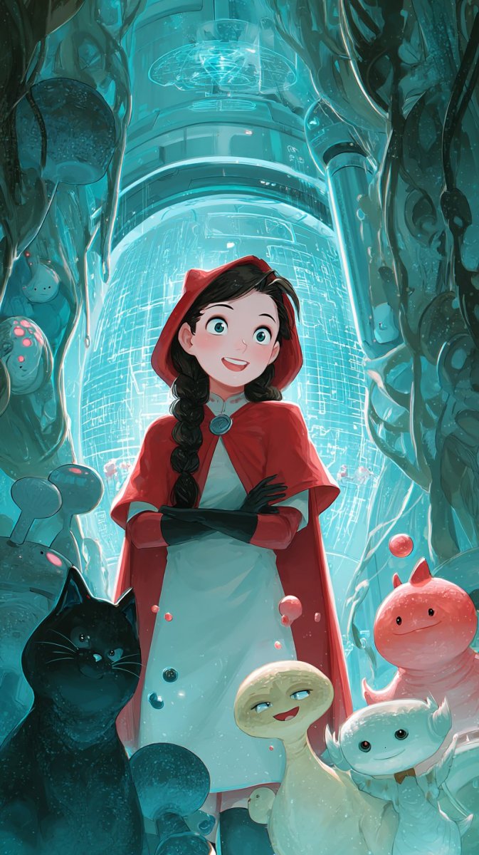 Красная Шапочка в космосе: сказка будущего и звездные друзья. Изображение из нейронной сети Midjourney - Midjourney примеры промтов - Форум ИИ о нейросетях - Yes Ai