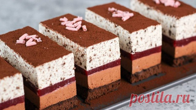 Изображение представляет собой аппетитные муссовые торты, выложенные на плоской тарелке. Каждый кусок имеет форму прямоугольника с четкими слоями: темный шоколадный бисквит, насыщенная ягодная прослойка, нежный мусс с вкраплениями шоколадных кусочков и сверху присыпанный какао порошком. Бисквит темно-коричневого цвета, а сам мусс кремово-белый с темными точками, создавая текстурный контраст. Шоколадные завитки розового цвета аккуратно разложены на верхушке каждого изделия, добавляя визуальную изысканность. Освещение мягкое, придающее изображениям теплый и уютный вид. Фон нейтральный серо-белый, подчёркивающий яркость и разнообразие цвета десертов. Изображение вызывает ощущение изящества и сладкой нежности, будто идеально приготовленные для праздничного стола угощение. Описание ингредиентов и размер пирожных написано на русском языке, подчёркивая культурную принадлежность приготовления.