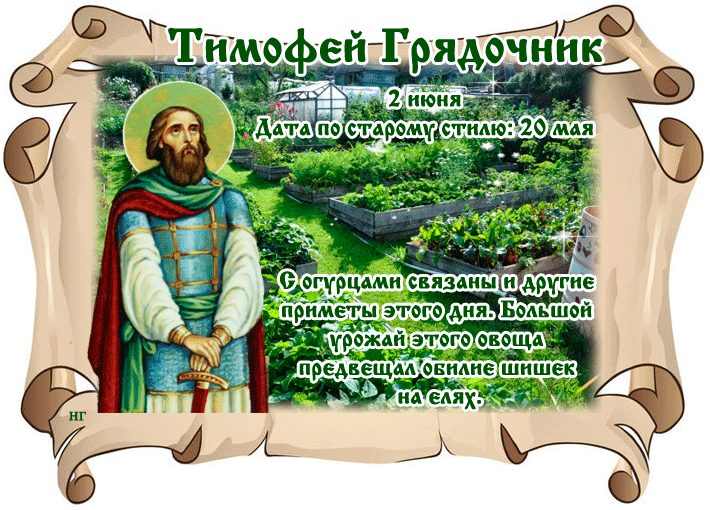 Изображение представляет собой красочную открытку, на которой изображён святой Тимофей Грядочник. Он одет в традиционные средневековые одежды: голубой хитон и красно-коричневый плащ, под которым виден зеленый пиджак. В его выражении спокойствие и мудрость, светлый нимб обрамляет голову. Фон состоит из зелёного сада, выполненного в насыщенных естественных цветах, с аккуратно уложенными грядками и теплицами, что создаёт атмосферу плодородия и ухоженности. Текст вокруг изображения содержит информацию о празднике, связанном с урожаем огурцов. Стилизованный текст подчеркивает день святого и его связи с огородничеством. Полупрозрачные свитки коричневого цвета ограничивают композицию по краям, усиливая ощущение рукописи и древности.