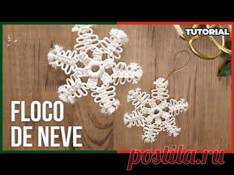 На изображении показаны две макраме снежинки, выполненные из белой пряжи, на деревянной поверхности светло-коричневого оттенка. Снежинки имеют сложный узор и кружевообразную текстуру, создающую эффект лёгкости и воздушности. Основные формы снежинок — это шестиугольные звезды с обильным количеством петлевых элементов. Рядом с ними на поверхности лежат золотистый крючок, на который можно повесить декоративный элемент, и несколько прозрачных булавок с металлическими головками. В левом нижнем углу изображение содержит текст "FLOCO DE NEVE", что означает "снежинка" на португальском языке. В правом верхнем углу, написано "TUTORIAL", что может указывать на учебное видео или руководство по созданию подобных украшений. Композиция изображения сбалансирована, с акцентом на эстетичность и ремесленное мастерство. Освещение мягкое, позволяющее увидеть текстуру материалов и детали изделия. Текстура деревянной поверхности придаёт объём и завершённость композиции. Это изображение свидетельствует о ручной работе и креативном подходе к созданию праздничных украшений.