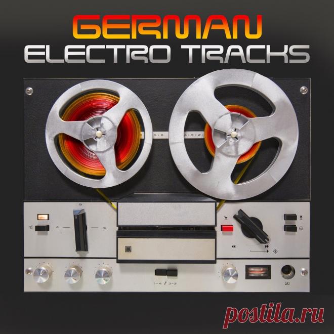 Изображение представляет собой винтажный катушечный магнитофон, выполненный в стиле ретро. На переднем плане видны две большие металлические катушки: одна из которых заполнена красной магнитной лентой. Они расположены симметрично, создавая баланс в композиции. Корпус устройства сделан из металлического материала с гладкой текстурой светло-серого цвета и черными элементами. Контрольные кнопки и переключатели расположены в нижней части магнитофона, выполнены в минималистичном стиле и включают круглые регуляторы громкости и небольшие переключатели. Объект освещен мягким, рассеянным светом, подчеркивающим его форму и детали. На фоне изображены стилизованные надписи "GERMAN ELECTRO TRACKS", выполненные в ярко-оранжевом и белом цветах, что добавляет динамичности и акцента на технологичность устройства. В общем, изображение вызывает ощущение ретро-ностальгии и погружает в атмосферу электроники прошлых лет.