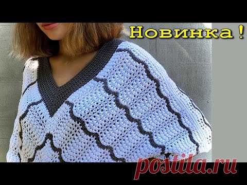 На изображении изображена девушка с короткими светло-каштановыми волосами, стоящая боком к камере перед серой стеной. На ней надет вязаный топ с V-образным вырезом, выполненный в светло-серых и темно-серых тонах. Узор на топе состоит из волнообразных линий, добавляющих объем и текстуру. Материал изделия напоминает хлопок или шерсть средней плотности, что создаёт ощущение комфорта и лёгкости. Освещение изображения естественное, без резких теней, что подчёркивает летнюю атмосферу. В левом верхнем углу изображена надпись "Новинка!" жёлтого цвета, выполненная четким и большим шрифтом, что придаёт изображению элементы маркетинга и рекламы. Над головой девушки слева видна часть текстуры стены из бетона, что создаёт минималистичный фон, подчёркивающий изделие. Изображение наполнено чувством новизны и намекает на модные тренды в вязании.