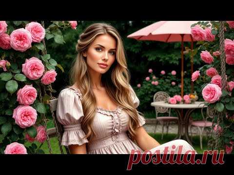На изображении изображена молодая женщина среди пышных розовых кустов, вероятно, в саду. Она одета в светлое платье с рукавами фонариками, которое гармонирует с розовым оттенком цветов вокруг. Волосы у женщины длинные и светлые, они развеваются на ветру, придавая образу романтичность. Её выражение лица спокойное и слегка улыбающееся, что создает атмосферу безмятежности. На втором плане видна садовая мебель, также розового цвета, и зонтик, который защищает от солнечных лучей. Освещение мягкое, придающее изображению теплоты и уюта. Композиция кадра предусматривает, что женщина находится в центре изображения, окруженная розами, что создает эффект естественной рамки. Исходя из деталей, можно предположить, что сцена касается спокойной прогулки в летнем саду, возможно, на территории частного дома. Картинка вызывает ассоциации с произведением "Ветром ночным (Роман Синицын)" благодаря своей утонченности и романтичности.