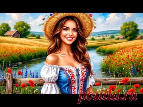 На изображении представлена молодая женщина в сельском пейзаже. Она стоит на фоне широкого поля, усеянного красными маками и голубыми цветами, которые создают яркий и красочный акцент. Женщина одета в традиционный сельский костюм: её платье сочетает белый и синий цвета, декорировано красочным орнаментом. На её плече лежит соломенная шляпа с цветами, которая добавляет легкости и романтичности образу. Широко улыбаясь, она излучает радость и спокойствие. Позади неё протекает небольшая речка, а вдали виднеется дом и зелёные деревья, что придаёт глубину композиции. Небо ясное, с белыми облаками, освещение яркое и солнечное, что указывает на летнее время года. Каждая деталь, от улыбки до нежных движений её волос, передаёт атмосферу безмятежности и природной красоты. Рядом с картиной отмечена надпись, которая гармонично вписывается в её образ.