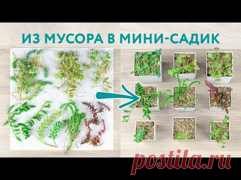 На изображении представлено создание мини-садика из остатков растений. Слева расположены обрезки суккулентов, таких как седумы, крассулы и крестовники, аккуратно разложенные на белой бумажной поверхности. Они имеют разнообразные оттенки зелёного и красного, что создаёт живописный и динамичный вид. Справа находятся белые квадратные горшочки, каждый из которых содержит посаженные фрагменты этих растений. Горшочки выстроены в два ряда на деревянной поверхности, создавая упорядоченный и эстетически приятный вид. Надпись «Из мусора в мини-садик» выделяется голубым цветом на светлом фоне и подчёркивает творческий процесс переработки. На изображении свет яркий и равномерный, подчёркивающий детали каждого растения и горшка, создавая свежую и вдохновляющую атмосферу. Центральная стрелка соединяет части композиции, указывая от обрезков к готовым посадкам, что усиливает ощущение трансформации и креативности. Эта работа, вероятно, призвана показать, как можно создавать красивые садики из самого минимального количества ресурсов.