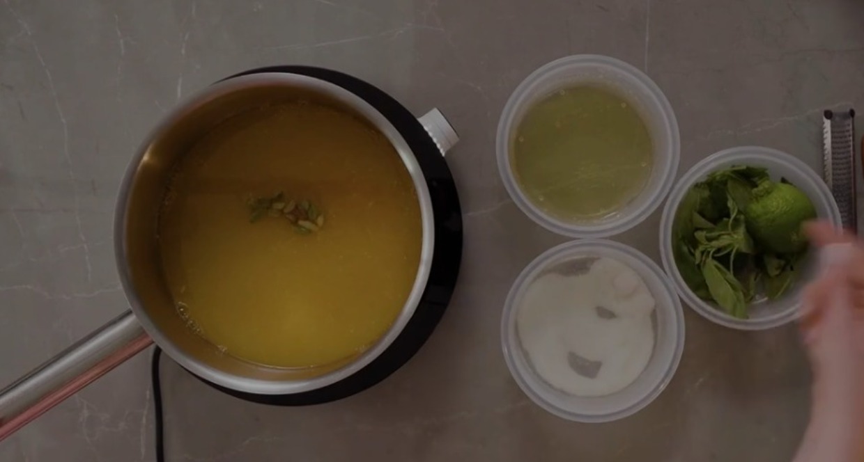 На изображении представлена кухонная сцена, на которой видно металлическую кастрюлю на электрической плите. В кастрюле находится жидкость ярко-желтого цвета, вероятно суп или соус, с кусочками зелени. Рядом с кастрюлей расположены три прозрачные пластиковые контейнеры: в одном — зеленый ингредиент, возможно, базилик, в другом жидкость светло-зеленого цвета, и в третьем — кристаллическое вещество белого цвета, напоминающее сахар или соль. Сцена освещена мягким светом, придающим изображению спокойную и уютную атмосферу. Фон представлен серой поверхностью, что подчеркивает минималистичный стиль. На изображении также видно руку человека, который, вероятно, готовится использовать ингредиенты из контейнеров. Композиция организована так, что все компоненты сцены хорошо видны и создают гармоничное восприятие. В правом нижнем углу располагается текст "Скриншот-10-06-2025 08:59:21.jpg", что может указывать на дату или время изготовления снимка. Сочетание естественных текстур и мягких тонов создает ощущение кулинарного творчества и домашнего уюта, отмечаемых в национальных кулинарных традициях.