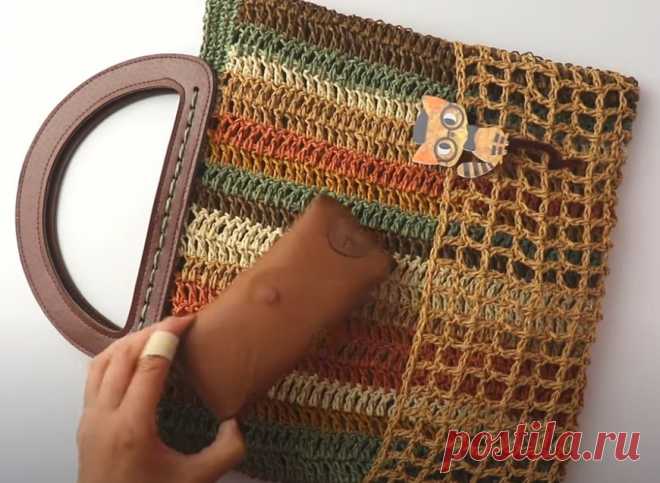 На изображении представлена стильная вязаная сумка с несколькими карманами, выполненная из разноцветной пряжи, с преобладанием оттенков зелёного, коричневого и бежевого цвета. На переднем плане видна рука, держащая коричневый чехол, который изготавливается из кожи и имеет блестящую поверхность. Сумка имеет овальные деревянные ручки тёмно-коричневого цвета. В верхней части прикреплён декор в виде милого мультяшного кота с большими глазами и полосатым хвостом. Фон состоят из светлого нейтрального оттенка, создавая контраст с теплыми цветами сумки. Композиция сосредоточена на текстурах вязания и плотной структуре карманов, которые обеспечивают функциональность и стиль аксессуара. Легкозаметное внимание к деталями дизайна создаёт ощущение домашнего уюта и ремесленного мастерства, что делает сумку привлекательной для любителей рукоделия.