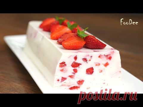 На изображении представлен нежный десерт, выполненный из творога и йогурта. Текстура десерта гладкая и кремообразная, с вкраплениями ярко-красных кусочков клубники. Основу составляет белый цвет с сочными акцентами клубничного оттенка. Блюдо оформлено на прямоугольной белой тарелке, придающей всей композиции элегантность. Сверху десерт украшен ломтиками свежей клубники и листиками мяты, создавая ощущение свежести и легкости. Освещение мягкое, подчеркивает контраст между белым фоном и яркими элементами. Светло-коричневый деревянный фон придает общему виду естественность и уют. Справа в верхнем углу присутствует надпись "FooDee", оформленная в легком и непринужденном стиле. Атмосфера изображения нежная и притягательная, идеально подходящая для летнего настроения или легкого перекуса.