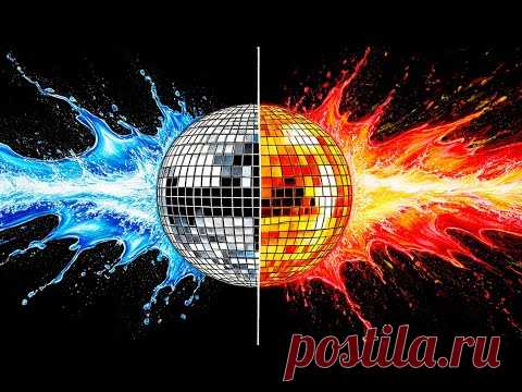 На изображении представлено контрастное и динамичное художественное произведение, разделенное вертикальной линией на две половины. В центре находится зеркальный шар, состоящий из мозаичных плиток, которые создают отражающие поверхности. Левая половина изображения окрашена в холодные синие и белые тона, символизирующие воду или лёд. Из этой половины исходят яркие всплески синих оттенков, создавая ощущение движения и энергии. Правая половина контрастирует с ней, используя теплые красные и оранжевые цвета, символизирующие огонь или тепло. Из этой стороны также выбиваются динамичные всплески, которые визуально напоминают потоки пламени. Введение текстовых элементов происходит гармонично, благодаря использованию части фразы, создающей связь с эмоциональной тематикой изображения. Это произведение искусства воплощает темы противоположностей и баланса, объединяя в себе свет и темноту, холод и тепло, создавая глубокое символическое значение. Присутствует ощущение напряжения и взаимодействия между разными элементами, что придаёт изображению эмоциональную насыщенность.