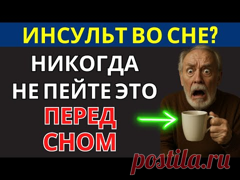 На изображении представлена тревожная сцена с пожилым мужчиной, который держит в руках белую кружку. Его лицо выражает удивление, широко раскрытые глаза и открытый рот подчеркивают эмоциональное состояние. Мужчина одет в коричневый свитер, что соотносится с простым и уютным стилем одежды. Фон изображения темный, что создает контраст с яркими элементами текста. В центре внимания также находится текст яркими буквами на черном фоне: "Инсульт во сне? Никогда не пейте это перед сном". Текст выполнен крупным шрифтом, использовано сочетание белого, красного и желтого цветов для привлечения внимания. Зеленая стрелка указывает на кружку, символизируя связь между напитком и упомянутым риском инсульта. Общая композиция изображения создает чувство настороженности и акцентирует важность заботы о здоровье, особенно для пожилых людей, так как привычки перед сном могут значительно повлиять на их самочувствие.