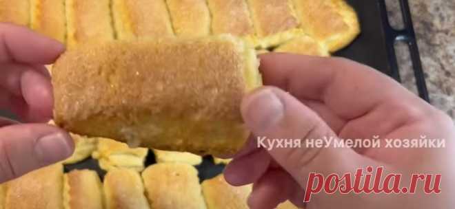 На изображении запечатлен процесс приготовления простого печенья. На переднем плане находятся две руки, держащие одно из изделий. Печенье имеет золотистый цвет с текстурой, напоминающей сахарную корку. Форма изделия продолговатая и слегка закругленная. На заднем плане можно увидеть поднос с уже испеченными аналогичными изделиями. Руки, удерживающие печенье, аккуратно его демонстрируют, что создает ощущение домашнего уюта и теплоты. Текстура печенья кажется хрустящей, а его поверхность однородно покрыта сахаром. Свет от яркой кухонной лампы падает на сцену, что добавляет тепло к общему восприятию. На фоне можно рассмотреть текст на русском языке, который дополняет атмосферу домашней кулинарии. Изображение вызывает ассоциации с простыми и вкусными домашними угощениями, которые идеально подходят к чаю, создавая уютную атмосферу.