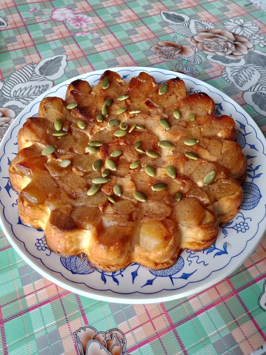 На фото изображен аппетитный закусочный кекс, украшенный семечками, лежащий на керамической тарелке с синим узором. Кекс имеет золотисто-коричневый цвет с текстурой, напоминающей хрустящую корочку. Поверхность его украшена тыквенными семечками, что добавляет аппетитный вид и акцент на натуральные ингредиенты. Форма кекса напоминает цветок с лепестками. Сама тарелка стоит на столе с яркой скатертью в шотландскую клетку, которая имеет розовые, зеленые и оранжевые полосы. Фоном можно видеть цветочные рисунки на скатерти, создающие атмосферу домашнего уюта и традиционного стиля. Освещение мягкое, дневное, вероятно, снимок сделан при естественном солнечном свете. Вся композиция создает ощущение легкости и простоты, соответствующее домашней выпечке и настройку на Систему осознанной жизни. "7 лучших рецептов недели от практиков Системы осознанной жизни: закусочный кекс с семечками, свекольный мусс, галета с клубникой | Nice&Easy | Дзен". Этот текст дополняет контекст предлагаемого домашнего блюда.