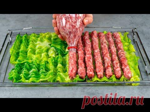 На изображении показана кулинарная сцена, где на решетке для гриля равномерно разложены свежие листья салата ярко-зеленого цвета. На листья выкладываются длинные колбасные палочки из мясного фарша розоватого оттенка. Процесс происходит с помощью пластиковой бутылки, наполненной фаршем, и открыт до половины, выглядывает только рука, держащая эту оригинальную импровизированную кулинарную насадку. Текстура листьев обладает насыщенным зелёным цветом, создавая контраст к мясу. Композиция кадра сосредоточена на производстве продукта, а освещение яркое и способствует выделению деталей и текстур ингредиентов. Картина отражает атмосферу спокойной домашней готовки, возможно, с элементами эксперимента или творчества на кухне. Текст поблизости подчёркивает значимость или секрет, имеющий отношение к процессу приготовления и кулинарным приемам.