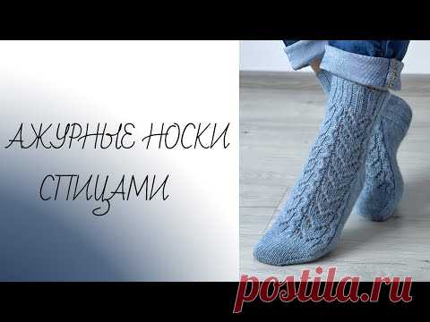 Изображение показывает пару ног, обутых в ажурные носки нежного голубого цвета. Эти носки связаны спицами, и их сложный узор включает в себя изящные переплетения и мотивы, придающие изделию лёгкость и элегантность. Ноги изображены в нежной позе с легким перекрещиванием на фоне светлого деревянного пола, что создает ощущение уюта и домашнего тепла. На ногах надеты джинсы, которые свободно подвёрнуты, чтобы показать изысканность носков. Освещение мягкое, создаёт тёплую и гостеприимную атмосферу. Композиция фотографии делится на две части: справа видим сами носки, а слева текст, написанный курсивом: "Ажурные носки спицами", что добавляет контекста изделию и подчёркивает его ручную работу. Визуально это делает акцент на текстуре и искусности вязания. Нейтральный фон помогает сосредоточиться на деталях изделия и его дизайне.
