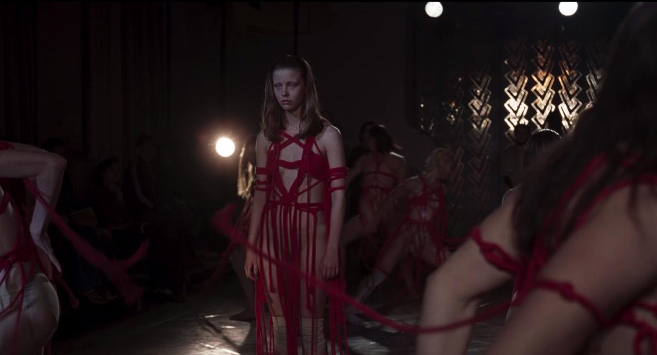 В центре изображения находится женщина с длинными светлыми волосами, одетая в красное платье, составленное из множества лент. Ее выражение лица серьезное и сосредоточенное, она смотрит прямо вперед. Вокруг нее находятся другие женщины в схожих одеяниях, их одежда создаёт ощущение динамики и движения. На заднем плане виден светлый источник освещения, придающий сцене театральный эффект. Фон затемнен, что выделяет фигуры на переднем плане. На лицах людей видны сосредоточенность и напряжение, что придаёт эмоциональный накал ситуации. Красный цвет в одежде символизирует страсть и интенсивные переживания. Вся сцена погружает в атмосферу драматического перформанса или театрального представления, подчеркивая художественный замысел создателей. Свет и тени используют для создания глубины и объема, усиливая визуальную композицию.