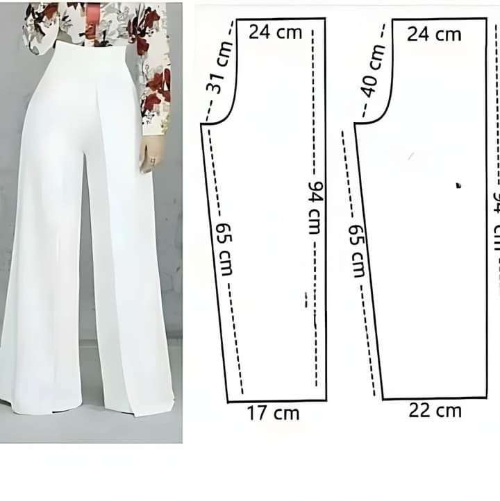 На изображении представлена пара широких белых брюк и выкройка для их пошива. Слева изображены брюки, выполненные из легкой ткани, возможно, шифона или трикотажа, которые создают элегантный и свободный силуэт. Они идеальны для теплой погоды, так как материал мягко драпируется и создаёт ощущение лёгкости. Верхняя часть брюк - высокая талия, которая подчеркивает фигуру и зрительно удлиняет ноги. Модель сочетает брюки с блузкой с цветочным принтом, где преобладают красные и бордовые оттенки на белом фоне. Это модное сочетание является примером аккуратного и стильного образа. Правая часть изображения содержит выкройки брюк, с размерами и линиями для пошива, что может быть полезно для швейного мастерства. Выкройка выполнена на белом фоне с чёрными линиями, чётко указывающими на ключевые детали и размеры таких элементов, как длина и ширина брюк. Изображение пина-истории на фоне подчёркивает важность и практическую ценность данного швейного примера.