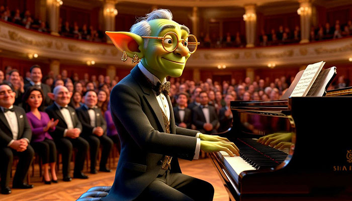 Прошли годы. Теперь этот самый гоблин восседал на сцене зала консерватории. В нарядном костюме-тройке, украшениях и золотых очках он уверенно играл перед многочисленной публикой. Когда последний аккорд замер в воздухе, зрители встали и разразились бурными аплодисментами. Маленький гоблин улыбнулся — путь от городских фонарей до сцены завершился триумфально.