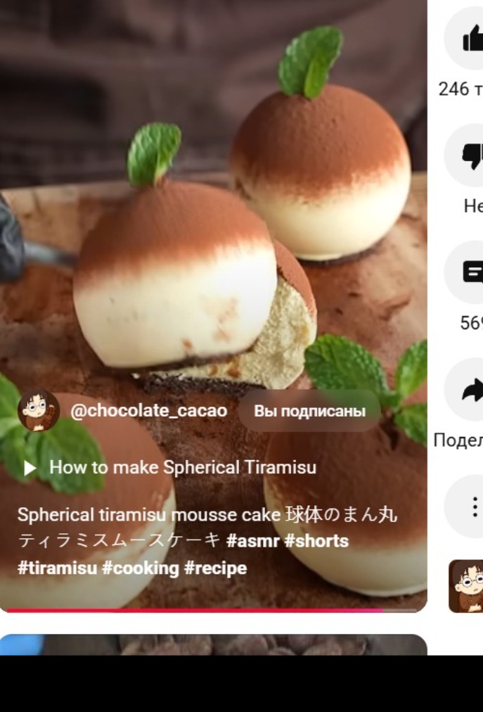 На изображении представлены необычные круглые десерты, которые напоминают сферический тирамису. Два полусферических лакомства расположены на деревянной поверхности, выполненной в тёплых коричневых тонах. Верхняя часть десертов покрыта коричневым какао-порошком, создавая аппетитный контраст с белоснежной кремовой основой. Между ними расположены свежие зелёные листья мяты, придающие композиции освежающий вид. Вкусный десерт аккуратно надрезан, позволяя увидеть нежную текстуру крема внутри. На заднем плане неясно виден коричневый фон, возможно создающий уютное впечатление. Справа в кадре видно несколько графических элементов и текст, включая описание клипа и хештеги, например, #tiramisu и #cooking. Сочетание текстур, материалов и цветов выделено мягким, естественным освещением, которое раскрывает всю глубину вкусов и вызывает у зрителя аппетит. Подвинуть время момента с 21:23:17 и добавить стилизацию под восточные мотивы с помощью японских символов передаёт дух многонациональной кулинарии.