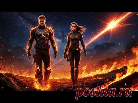 Изображение в киношном стиле показывает двух человек, идущих по пылающему полю с лавой и огнем, окружающим их. На переднем плане видны две фигуры: мужчина и женщина, одетые в темные, облегающие костюмы с элементами, напоминающими супергеройские или тактические костюмы. На костюмах видны светящиеся линии, усиливающие атмосферу напряженности. Огонь и лава создают яркие оранжевые и красные оттенки, контрастирующие с темными силуэтами персонажей. Вдалеке на ночном небе видна падающая комета, которая оставляет светящийся след. Эмоционально насыщенная сцена с динамичным действием и сильным напряжением создает ощущение неминуемой опасности. Выражение лиц героев серьезное и сконцентрированное, с прямым взглядом, что придает сцене решимость и целеустремленность. Имя "Fire Inside ReMIX" (ROMAN SINICYN) может быть связано с музыкальной композицией или арт-проектом, что подчеркивает креативный и художнический подход.