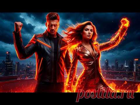 На изображении изображены двое людей — мужчина и женщина, стоящие на фоне ночного города. Мужчина одет в черную кожаную куртку с оранжевыми вставками, его поза выражает уверенность и решимость. Он поднял руку в жесте силы. Женщина одета в блестящий металлический костюм с элементами огня, который драматично пылает на правой руке. Ее волосы развеваются, создавая эффект движения и оживленности. Взгляд женщины направлен вперед, в нем читается сосредоточенность и решимость. Фон изображает городской пейзаж с небоскребами, окруженными темными грозовыми облаками, что создает напряженную и драматичную атмосферу. Оранжевые огни и пламя усиливают ощущение силы и энергии в изображении, добавляя элементы фантастики и визуальных эффектов. Общее освещение подчеркивает контраст между холодными оттенками неба и горячими пламенными акцентами.