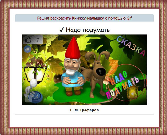 Изображение представляет собой сцену из мультфильма или детской компьютерной игры с яркими, насыщенными цветами. На переднем плане находится забавный гном с красной шапкой, с белой бородой и в голубом свитере. Рядом с ним стоит собака с длинными ушами, которая улыбается. Фон выполнен в тёплых оттенках зелёного и жёлтого, создавая атмосферу сказочного леса. Присутствуют элементы анимации, такие как разноцветные надписи "СКАЗКА" и "Надо подумать", добавляющие чувство интерактивности. В левом углу изображены иконки социальных сетей, такие как "пальчик вверх" и комментарий, что свидетельствует о современном мультимедийном контексте. В верхней части изображения видны надписи, связанные с решением раскрасить книжку с помощью GIF. Атмосфера сцены весёлая и игривая, что удачно передает лёгкость и радость детства, дополняется текстом: "Потом из одного яичка вылез цыплёнок. — Доброе утро, — сказал он солнышку." В нижней части упоминается имя Г. М. Цыферова, что связывает изображение с его литературным миром. Всё это происходит на фоне стилизованной рамки, создающей впечатление открытой книги.