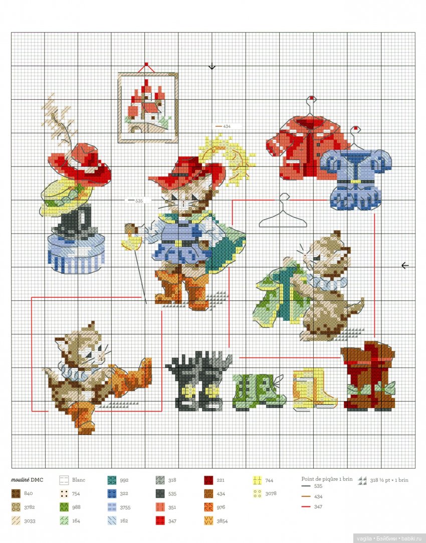 На изображении представлена схема вышивки крестом, выполненная в стиле мультяшного рисунка. Цветовая палитра включает яркие и насыщенные оттенки красного, зеленого, синего и коричневого. Основным действующим лицом является персонаж в образе Кота в сапогах. Он изображен в шляпе с красным пером, с мечом в руке, одетый в сказочный костюм с элементами средневековой моды. Кот стоит в горделивой позе на фоне белого квадрата, который разделен на ячейки для удобства вышивания. Другие элементы — это элементы одежды и обуви, такие как сапоги и плащ, висящие на фоне. В верхнем углу изображения висит небольшой рисунок замка. Схема дополнена обозначениями цветовой гаммы и номеров ниток DMC. Настроение изображения игривое и сказочное, передающее атмосферу французской вышивки. Дизайн фокусируется на деталях и красочности, подчеркивая рукодельное мастерство. Светлое фоновое освещение создает контраст, подчеркивая насыщенность цветов и структурную сложенность рисунка.