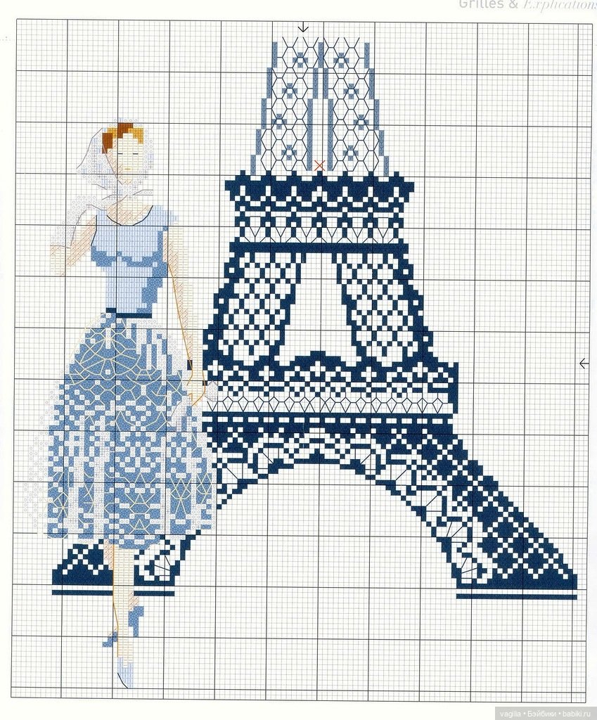 На изображении представлена схема вышивки крестом с французским мотивом. Фон состоит из мелкой сетки на белом фоне, служащей для удобства в работе над вышивкой. Центральное место занимает Эйфелева башня, выполненная в темно-синих и белых цветах. Её геометрический орнамент придаёт изображению изысканный и современный вид. На переднем плане изображена женщина в платье, которое гармонично сочетается с цветами башни. Её фигура выполнена в голубых и белых оттенках. Верх платья без рукавов, подчёркивает её женственность, а юбка с узорами дополняет элегантность образа. У волос девушки рыжеватый оттенок, они аккуратно уложены. Взгляд и жесты персонажа свидетельствуют о романтичной и мечтательной атмосфере. Изображение не употребляет буквенных надписей, но все детали связаны с темой французской вышивки и романтической символикой Парижа.