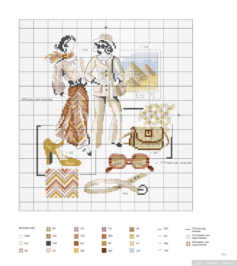На изображении представлена схема для вышивки крестом с элементами моды и путешествий. В центре находятся две фигуры: мужчина и женщина в стильной одежде, характерной для летнего отпуска. Вокруг видны аксессуары, такие как золотистые туфли, коричневая сумка и большие очки. Фон имеет изображение пирамид, что может указывать на египетские мотивы и лето 75-го года, обозначенного как "ETE 75". Цветовая палитра включает теплые и песочные тона. Все детали расположены на сетке с обозначениями цветов ниток, что придает картине структурированный вид. Присутствуют текстуры, связанные с модой 70-х, и символика путешествий, интегрированные в вышивку. Стиль изображения напоминает ретро, акцентируя внимание на модных тенденциях и аксессуарах того времени, а также на ретро-атмосфере во время путешествий.