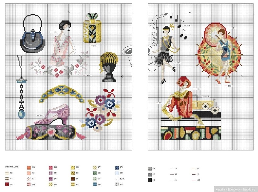 На изображении представлены схемы для вышивки крестом, выполненные в стиле французской вышивки. Изображены различные декоративные элементы и фигуры, включая модных персонажей 1920-х годов, каждая с характерным дизайном одежды и аксессуаров того периода. Фигуры выполнены в яркой цветовой гамме с акцентами на красные, желтые и черные оттенки, что создает яркий и стильный художественный эффект. Орнаменты включают изящные цветочные мотивы и геометрические узоры, типичные для арт-деко. На переднем плане видны детали, характерные для вечерней моды, такие как сумка и аксессуары для волос. Одним из центральных элементов является изображение танцующей пары, оформленной в золотых и черных тонах, что передает атмосферу джазовой эры. Фон представлен в виде клетчатой сетки, которая служит основой для размещения схемы. В нижней части изображение включает легенду с номерами и обозначениями ниток, что позволяет точно воспроизвести цвета и детали вышивки. Текстура изображения и присутствие знакового шрифта придают всей композиции винтажный и утонченный вид.