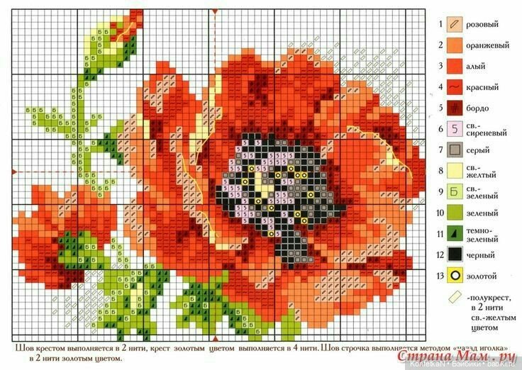 На изображении представлена схема вышивки крестом яркого красного мака. Центральным элементом является цветок с богатым сочетанием оттенков от светло-оранжевого до глубокого бордового. Вокруг мака заметно множество листьев, выполненных в разных тонах зеленого. Материалы включают в себя цветные нитки, которые изображены в виде квадратиков на сетке, что создает пиксельную текстуру. Детали представлены таблицей с номерами и соответствующими цветами ниток, где указаны оттенки, такие как розовый, оранжевый, золотой и черный. На схеме заметны инструкции по технике вышивки, объясняющие, сколько нитей следует использовать. Атмосфера работы вызывает ощущение весеннего возрождения и легкости. Светлая цветовая палитра и гармоничное расположение элементов на схеме делают этот фрагмент привлекающим внимание. Также в правом нижнем углу указаны дополнительные пояснения с упоминанием источника.
