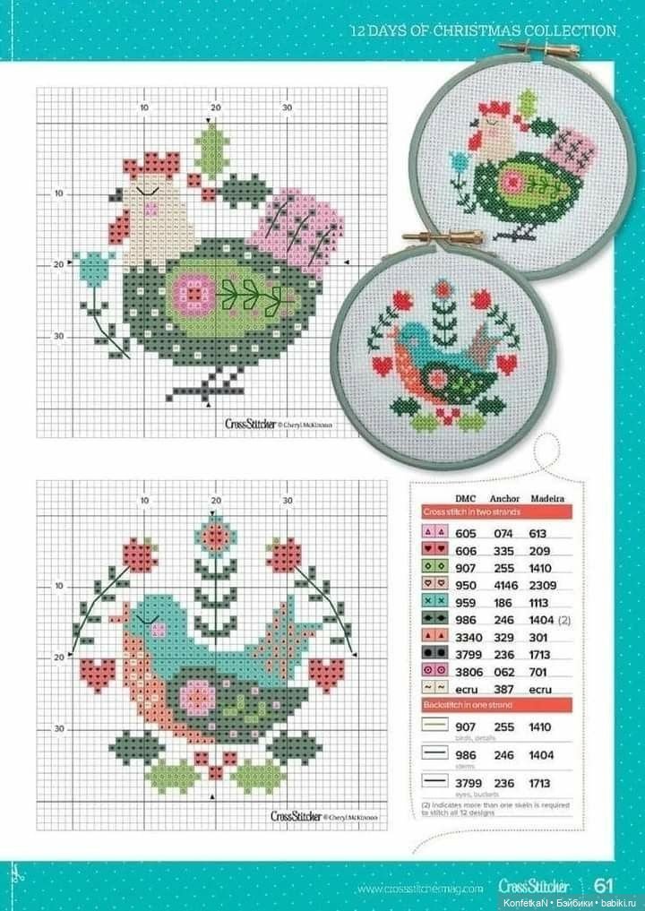 Изображение представляет собой схему вышивки крестиком из коллекции "12 Days of Christmas". На изображении представлены два дизайна, выполненные в виде птиц, окруженных цветочными узорами. Верхняя левая часть изображения показывает схему первого дизайна, где доминируют зелёные и розовые цвета, с аккуратно расположенными пикселями, символизирующими стежки. На другом участке видна уже законченная вышивка, заключённая в круглую деревянную рамку. Аналогично, внизу показана другая схема с голубой птицей в окружении ярких цветков, включая красные и зелёные оттенки. Оба дизайна выполнены на белой канве с сеткой, помеченной цифрами от 0 до 30 по обеим осям. Справа расположена таблица с цветовой палитрой, где указаны номера и символы ниток DMC, Anchor и Madeira. Дизайны наделены радостным и праздничным настроением, иллюстрируя приближение весны и гармонию природы. Свежие, жизнерадостные цвета создают атмосферу уюта и творчества.