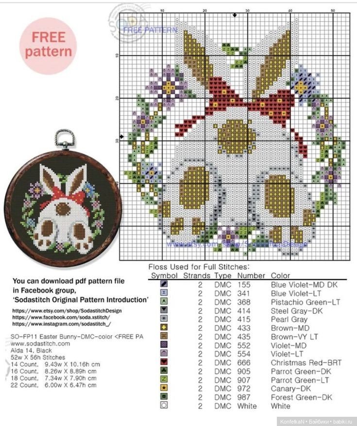 На изображении представлена схема вышивки крестом, изображающая милого зайца с большими ушами и пушистым хвостиком. Заяц украшен красным бантом и окружен цветочным венком с фиолетовыми, зелеными и желтыми цветами. Основные цвета схемы включают белый, коричневый и различные оттенки фиолетового и зеленого. Справа от рисунка можно увидеть таблицу, указывающую номера цветов нити и количество стежков. На левой стороне изображение заготовки в круглой рамке, демонстрирующей конечный вид работы. Атмосфера весенняя, радостная, с элементами народного творчества. Здесь также интегрирована надпись "Весна идет, весне дорогу - Схемы вышивки крестом | Бэйбики - 412099", что добавляет тематическую весеннюю нотку. В целом, компоновка изображения логична и ясно структурирована, светлая палитра создает спокойное и приятное впечатление.