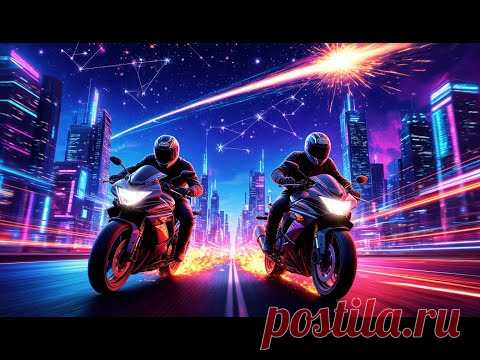 На изображении перед нами динамичная сцена, изображающая двух мотоциклистов, стремительно движущихся по неоновой дороге в футуристическом городе. На фоне можно увидеть ярко освещенные небоскребы, создающие атмосферу ночного мегаполиса. Вселенная синего, фиолетового и розового оттенков обволакивает небосвод, где виднеются созвездия и метеоры, добавляющие фантастический элемент. Мотоциклисты одеты в черные защитные костюмы и шлемы, создающие чувство безопасности и одновременно таинственности. Их мотоциклы оставляют огненные следы на асфальте, подчеркивая скорость и энергию движения. Свет фар и отражение света от здания усиливают иллюзию стремительного бега через ночной город. Надпись "Burn Through the Night (ROMAN SINICYN)" ассоциируется с атмосферой скоростного влечения, символизируя мощь и смелость. Общее освещение создаёт резкие контрасты и выделяет детали на переднем плане, придавая глубину и объём сцене.