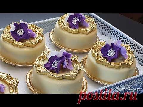 В этой яркой и привлекательной композиции изображены мини-шоколадные торты, каждый из которых аккуратно оформлен на золотистых подставках. В центре каждого торта находится декоративное обрамление золотого цвета с фиолетовыми и белыми сахарными цветами, создающими изысканный акцент. Цветы расположены симметрично и украшают верхушку, добавляя роскошный и праздничный вид. Текстура торта гладкая, с легким блеском, подчеркивающая качество и внимание к деталям. Контраст пастельного кремового оттенка торта с ярким золотистым и насыщенным фиолетовым цветом цветов создает впечатляющий визуальный эффект. Фон выполнен в темных тонах, что подчеркивает яркость и утонченность десерта на переднем плане. Процесс приготовления этого вкусного мини-шоколадного торта невероятно прост! Общий настрой фотографии говорит о празднике и изысканности, сочетая современные элементы с традиционным шармом.