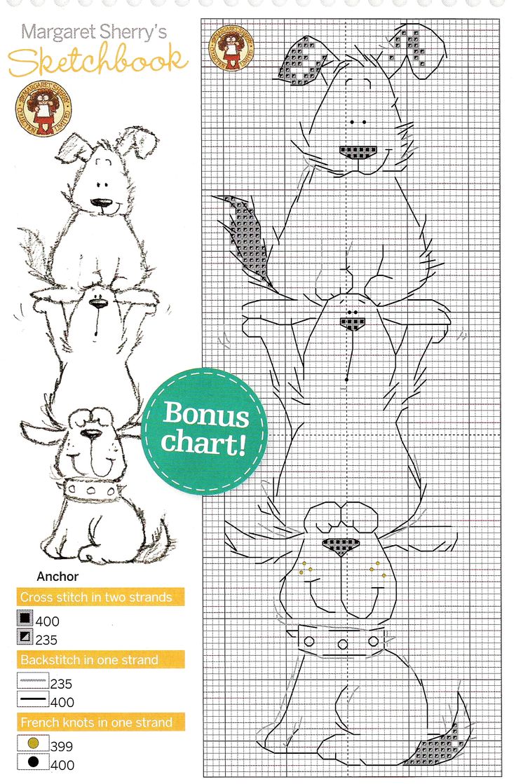 На изображении представлен дизайн для вышивки, созданный художницей Маргарет Шерри. На плотной бумаге, покрытой клетчатым узором, изображены три забавные собаки, расположенные друг над другом. Высокий черно-белый пес в верхней части выглядит энергичным с приподнятыми ушами и улыбчивой мордой. Средняя собака с крупными ушами и спокойным выражением лица, а нижняя собака уверенно сидит с закрытыми глазами и поднятым носом, выражая довольство. Справа на изображении — схематическое представление того же рисунка в виде вышивки с подробной цветовой кодировкой для схемы. Рядом расположен текст "Margaret Sherry"s Sketchbook", выполненный в каллиграфическом стиле. Цвета кремового и белого фона создают мягкую и уютную атмосферу, и изображенные в легком и юмористическом стиле собаки добавляют игривости. В правом нижнем углу можно заметить выделенную область с надписью "Бонус схема", придающую изображению дополнительную ценность для людей, занимающихся рукоделием. Общий стиль дизайна отражает творчество Маргарет Шерри, известной своим уникальным подходом к вышивке.