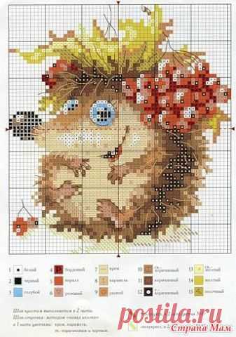 Изображение представляет собой схему вышивки крестиком, на которой изображён милый ёжик с большими синими глазами. Ёжик украшен осенними листьями, сочно-красными ягодами на голове, создавая праздничное и тёплое настроение. Цвета вышивки варьируются от светло-коричневого и бежевого до ярко-красного и зелёного, что придаёт персонажу эффект живописности. На схеме заметны квадратные ячейки с различной кодировкой цветов, стандартные для таких шаблонов. Фон выполнен в виде клетчатой бумаги, подчёркивающей рукотворный характер работы. Ниже ёжика представлены коды цветов с обозначением необходимого количества нитей и техники вышивки. Светлый фон создаёт уютную атмосферу и подчёркивает детали вышивки. Вся композиция символизирует приход зимних праздников благодаря сочетанию красочного осеннего окружения и забавного персонажа. Лёгкая ассоциация с темой "Новогодняя вышивка крестиком" подчёркивает эмоциональную теплоту и уюта изделия.