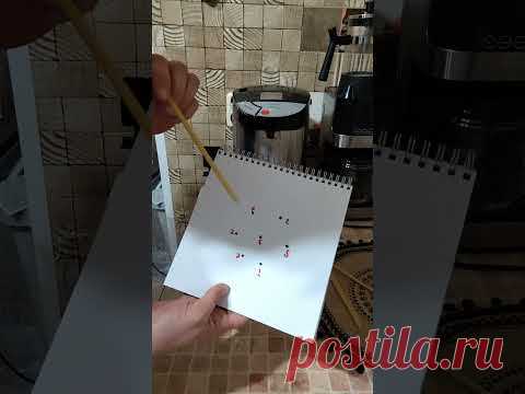 На изображении запечатлен процесс, в котором человек держит лист бумаги и указывает деревянной палочкой на нее. Лист — белый блокнот, на котором видны несколько точек и цифр, нарисованных темным и красным цветами. Человек одет в повседневную одежду, но большинство его тела скрыто за кадром. Руки сосредоточены на бумаге, создавая впечатление задумчивости и концентрации. Сзади видна кухонная техника, включая кофемашину и небольшой кухонный прибор на плитке с бежево-коричневыми квадратами. Освещение ровное, без резких теней, что подчеркивает детали обстановки. Настрой изображения уютный, характерный для домашней атмосферы. Надпись "МИСТИКА - ОБРЯД НА ОМОЛОЖЕНИЕ 🔥" намекает на магические и ритуальные действия, возможно в контексте молодости и здоровья. Перспектива изображения показывает акцент на руке и бумаге, в то время как фон становится второстепенным элементом. Кухонная техника смотрится современной, добавляя контраста между традиционными и современными элементами.